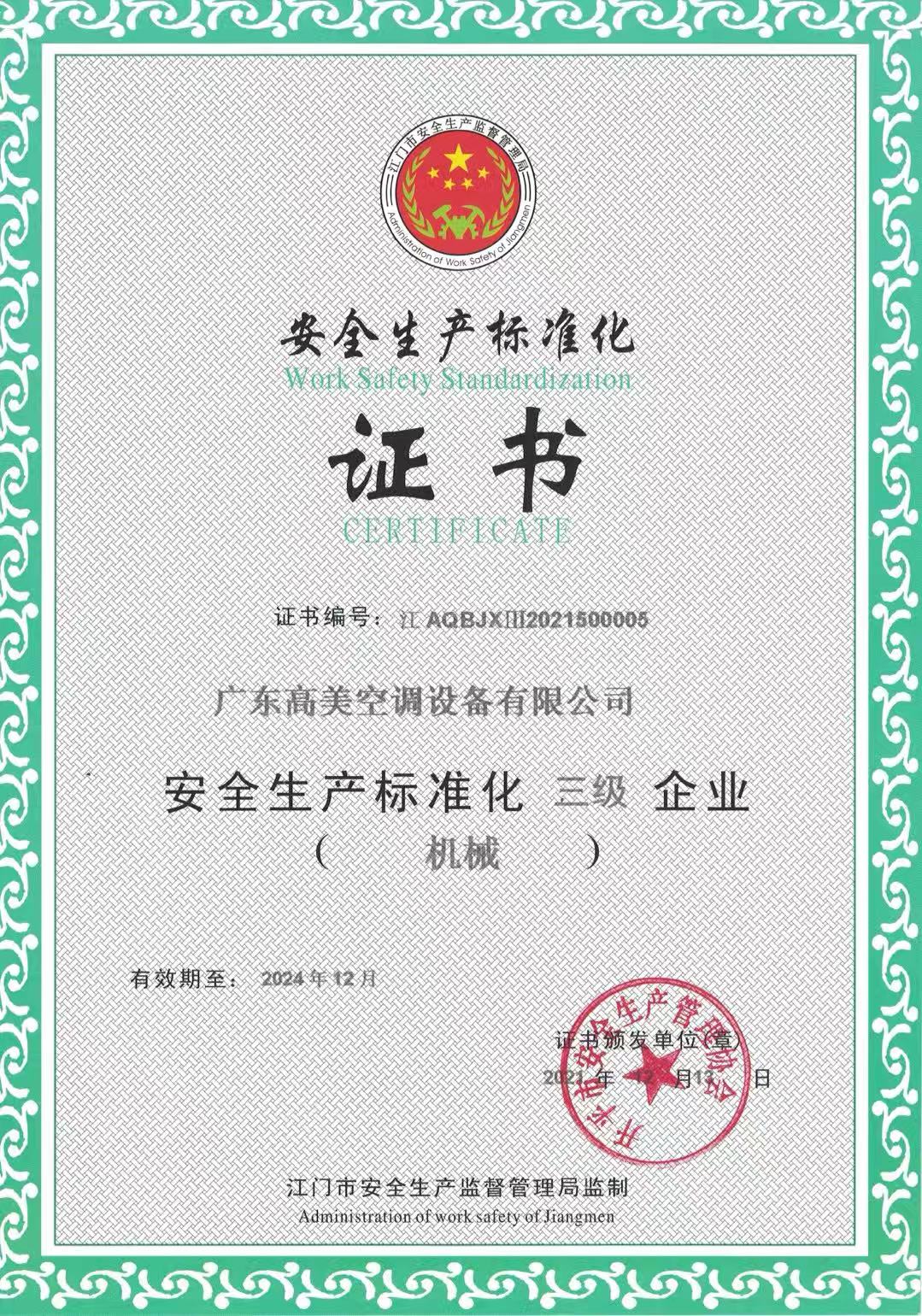 祝(zhu)賀廣(guang)東高(gao)美(mei)空調(diao)設(she)備有限公司取得安全(quan)生(sheng)産(chan)標準(zhun)化(hua)三級認證(zheng)證(zheng)書
