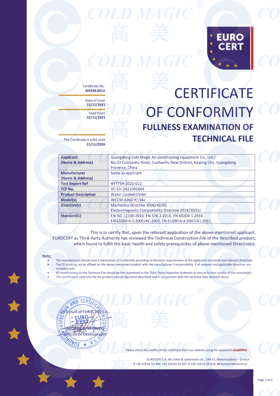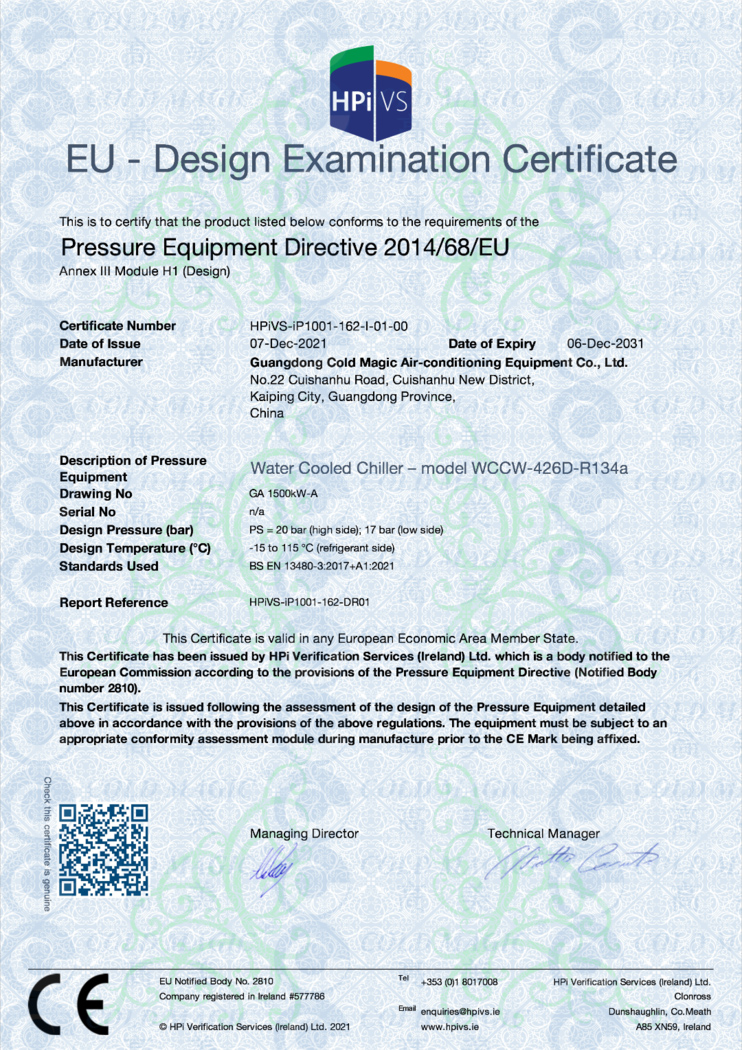貨櫃式水冷冷水(shui)機組取得CE & PED認證證書(shu)